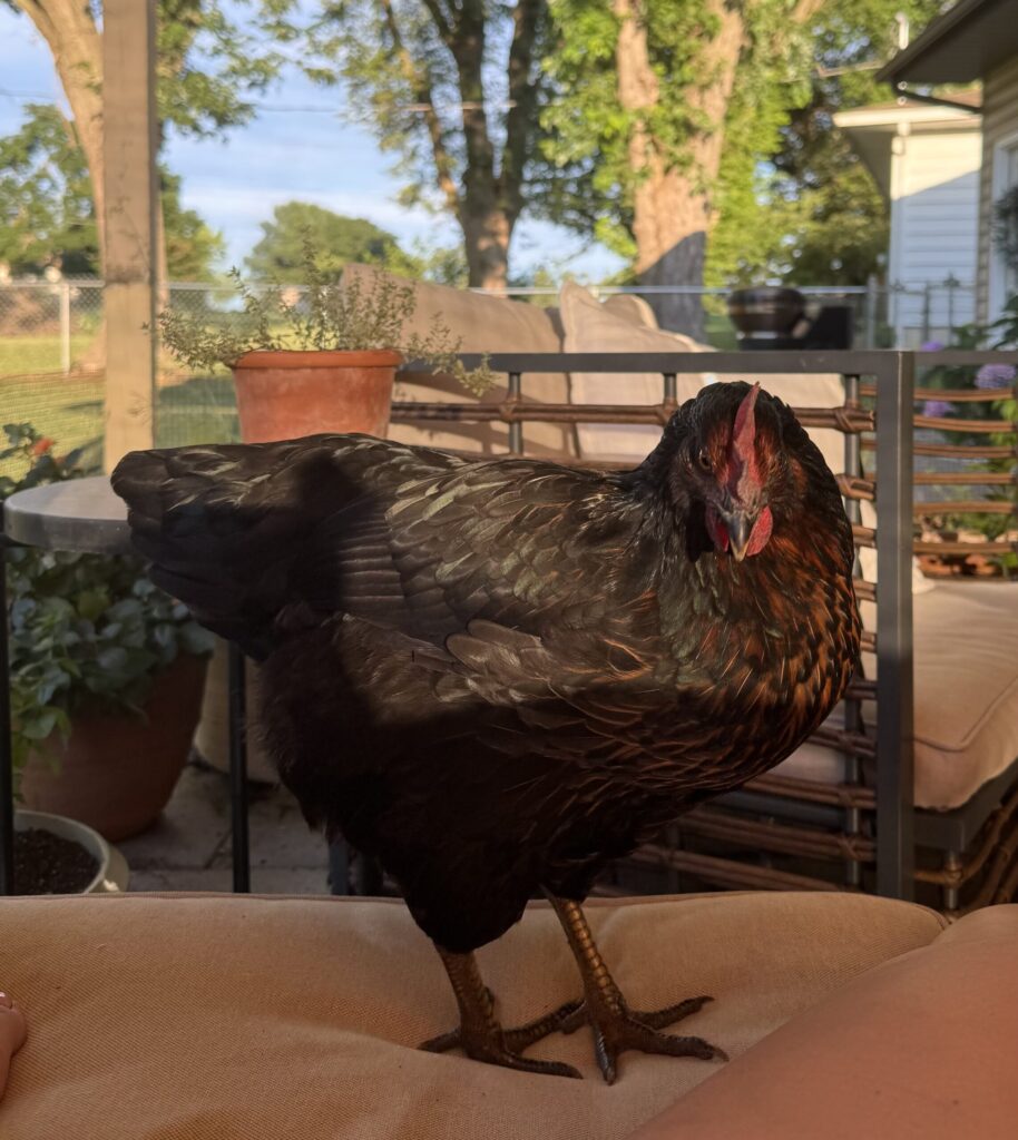 Betty is molting and I think she’ll be my last one of the season as the days continue to get longer. She’s our Black Sex Link and my best girl — head hen with the gentlest spirit. She never bullies, never pecks unnecessarily, but heaven help anyone who gets aggressive toward me. She’ll step in immediately. I love her for it.