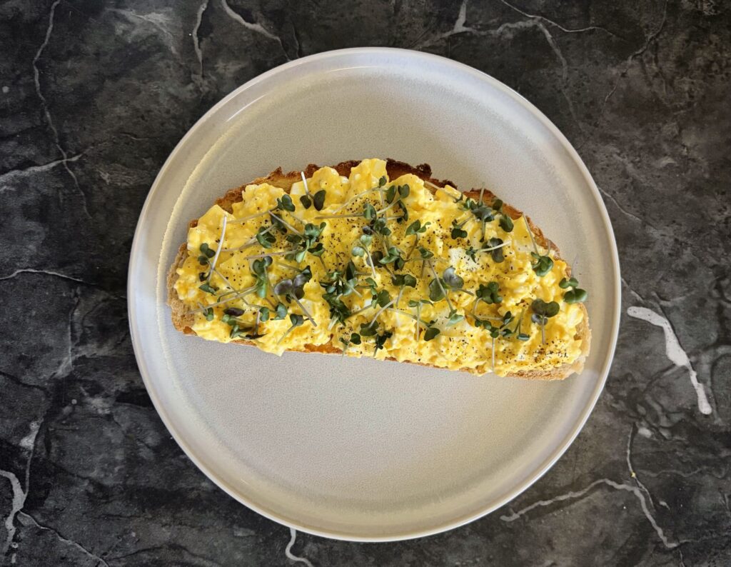 I tried my hand at radish greens last week and they are phenomenal. They carry that classic radish heat but somehow feel delicate at the same time. I’ve been making a higher-protein egg salad toast for breakfast (adding cottage cheese for the extra protein) and can’t wait to top it with them this week. I’m growing arugula sprouts for this week’s microgreens — stay tuned to see how they do!